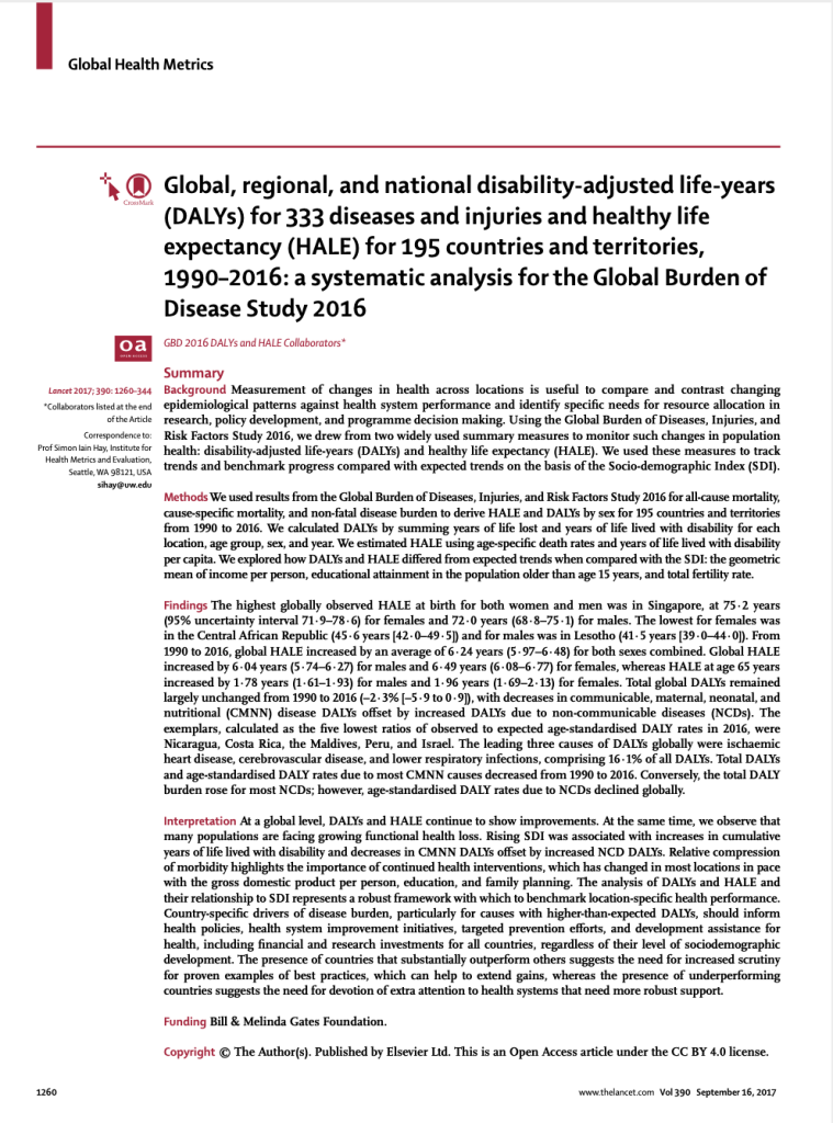 Citation: Lancet. 2017 Sep 16;390(10100):1260-1344. Authors: GBD 2016 DALYs and HALE Collaborators* Abstract: Measurement of changes in health across locations is useful to compare and contrast changing epidemiological patterns against health…