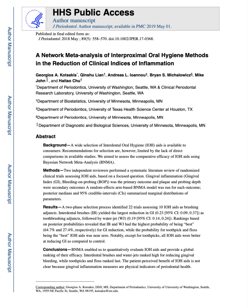 Citation: J Periodontol. 2018 May;89(5):558-570. Authors: Georgios A. Kotsakis, Qinshu Lian, Andreas L. Ioannou, Bryan S. Michalowicz, Mike John, Haitao Chu Abstract: A wide selection of Interdental Oral Hygiene (IOH) aids is available to consumers. Recommendations…