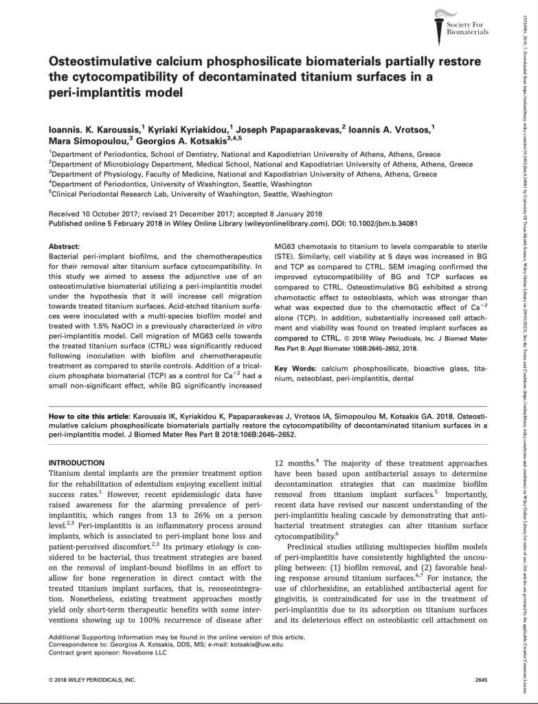 Citation: J Biomed Mater Res B Appl Biomater. 2018 Oct;106(7):2645-2652. Authors: Ioannis. K. Karoussis, Kyriaki Kyriakidou, Joseph Papaparaskevas, Ioannis A. Vrotsos, Mara Simopoulou, Georgios A. Kotsakis Abstract: Bacterial peri-implant biofilms, and the chemotherapeutics for their removal…