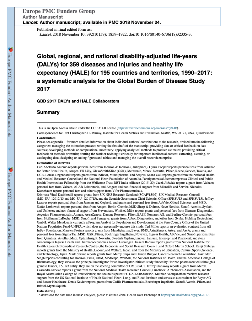 Citation: Lancet. 2018 Nov 10;392(10159):1859-1922. Authors: GBD 2017 DALYs and HALE Collaborators Abstract: How long one lives, how many years of life are spent in good and poor health, and how…