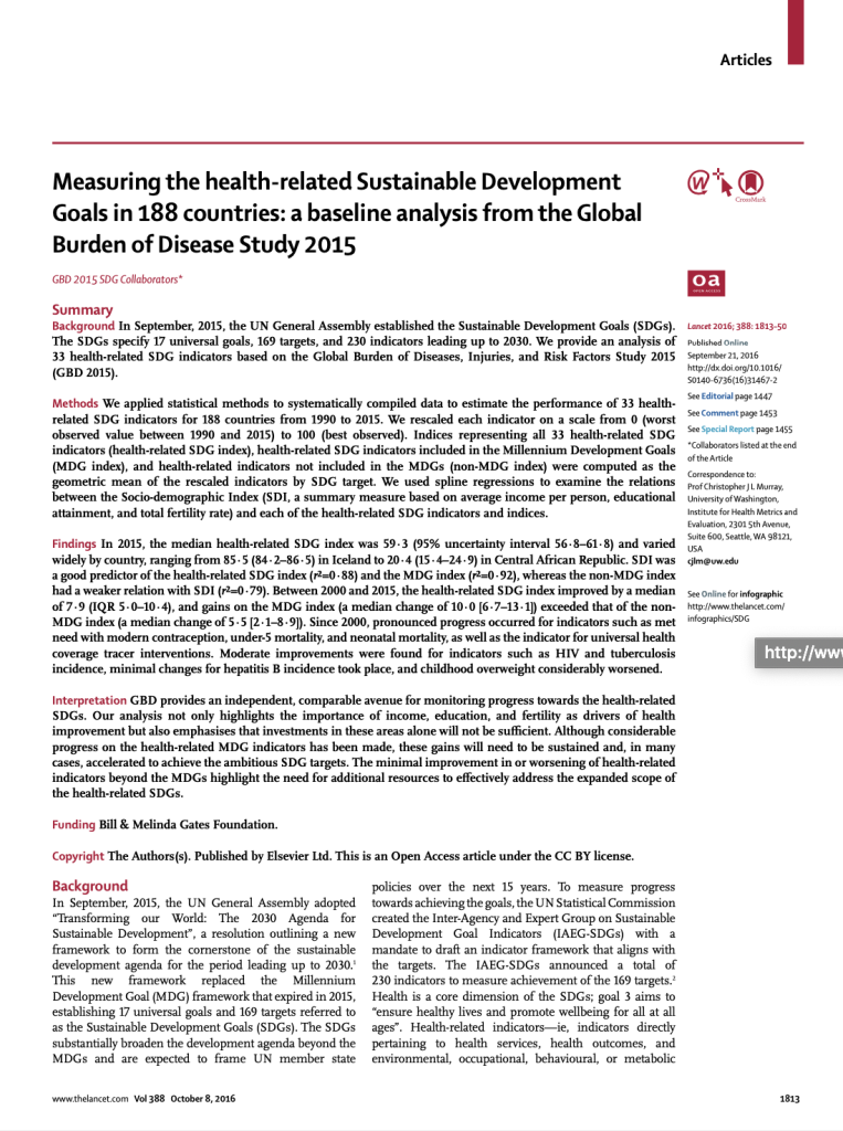 Citation: Lancet. 2016 Oct 8;388(10053):1813-1850. Authors: GBD 2015 SDG Collaborators Abstract: In September, 2015, the UN General Assembly established the Sustainable Development Goals (SDGs). The SDGs specify 17 universal goals,…