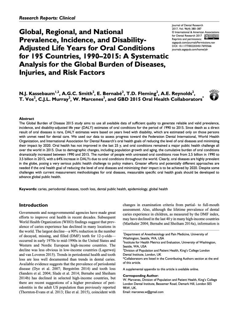 Citation: J Dent Res. 2017 Apr;96(4):380-387. Authors: N.J. Kassebaum, A.G.C. Smith, E. Bernabé, T.D. Fleming, A.E. Reynolds,T. Vos, C.J.L. Murray, W. Marcenes, and GBD 2015 Oral Health Collaborators Abstract: The Global…