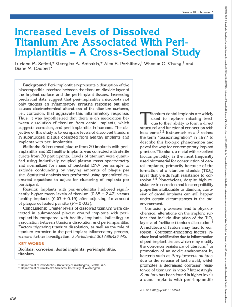 Citation: J Periodontol. 2017 May;88(5):436-442. Authors: Luciana M. Safioti, Georgios A. Kotsakis, Alex E. Pozhitkov, Whasun O. Chung, and Diane M. Daubert Abstract: Peri-implantitis represents a disruption of the biocompatible interface between the…