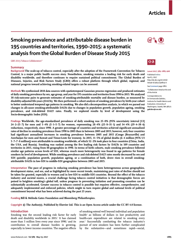 Citation: Lancet. 2017 May 13;389(10082):1885-1906. Authors: GBD 2015 Tobacco Collaborators Abstract: The scale-up of tobacco control, especially after the adoption of the Framework Convention for Tobacco Control, is a major public…