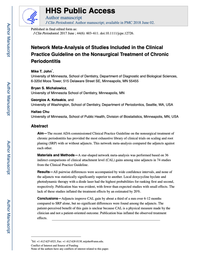 Citation: J Clin Periodontol. 2017 Jun;44(6):603-611. Authors: Mike T John, Bryan S Michalowicz, Georgios A Kotsakis, Haitao Chu Abstract: The recent ADA-commissioned Clinical Practice Guideline on the nonsurgical treatment of chronic…