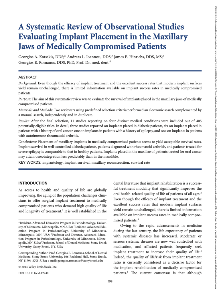 Citation: Clin Implant Dent Relat Res. 2015 Jun;17(3):598-609. Authors: Georgios A. Kotsakis, Andreas L. Ioannou, James E. Hinrichs, Georgios E. Romanos Abstract: Even though the efficacy of implant treatment and the excellent…