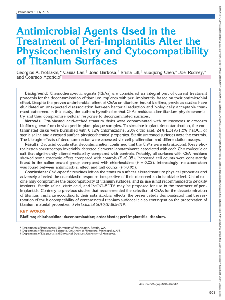 Citation: J Periodontol. 2016 Jul;87(7):809-19. Authors: Georgios A. Kotsakis, Caixia Lan, Joao Barbosa, Krista Lill, Ruoqiong Chen, Joel Rudney, and Conrado Aparicio Abstract: Chemotherapeutic agents (ChAs) are considered an integral part of current treatment protocols for…