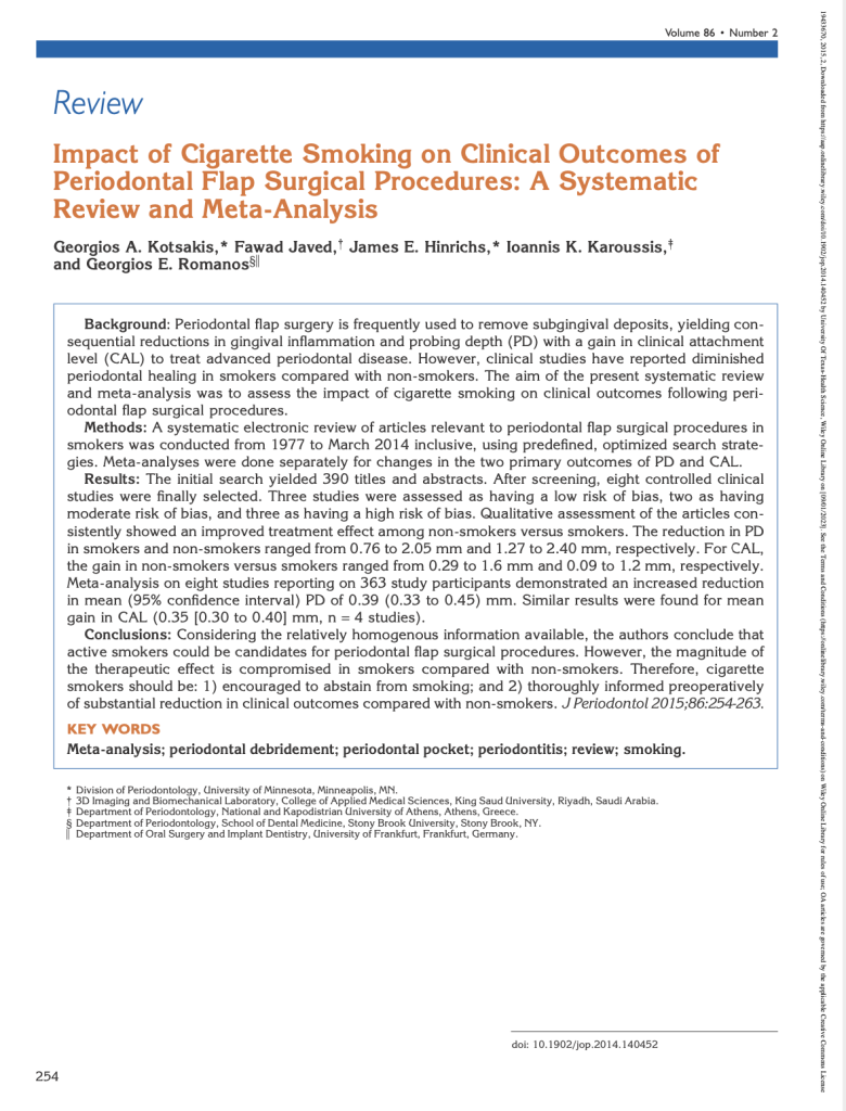 Citation: J Periodontol. 2015 Feb;86(2):254-63. Authors: Georgios A. Kotsakis, Fawad Javed, James E. Hinrichs, Ioannis K. Karoussis, and Georgios E. Romanos Abstract: Periodontal flap surgery is frequently used to remove subgingival deposits,…