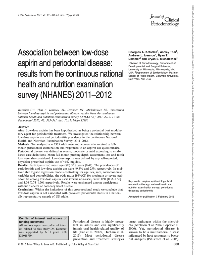 Citation: J Clin Periodontol. 2015 Apr;42(4):333-41. Authors: Georgios A. Kotsakis, Ashley Thai, Andreas L. Ioannou , Ryan T. Demmer, and Bryan S. Michalowicz1 Abstract: Low-dose aspirin has been hypothesized as being…