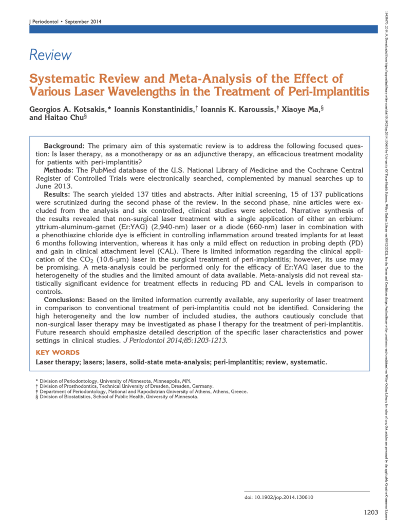 The primary aim of this systematic review is to address the following focused question: Is laser therapy, as a monotherapy or as an adjunctive therapy, an efficacious treatment modality for…