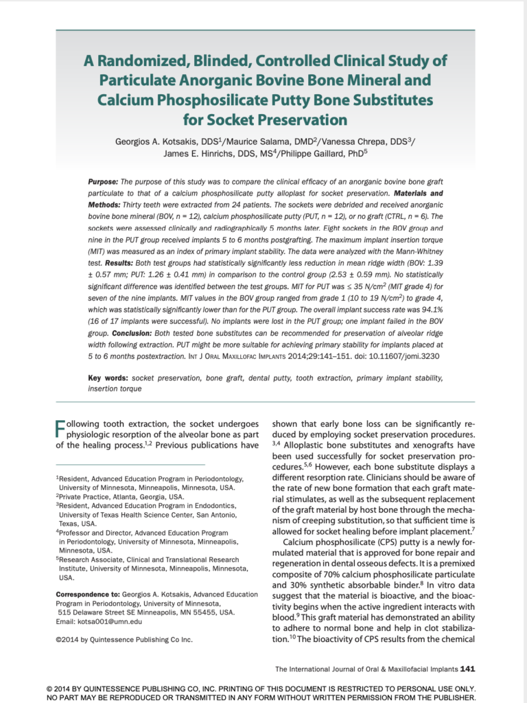 Purpose: The purpose of this study was to compare the clinical efficacy of an anorganic bovine bone graft particulate to that of a calcium phosphosilicate putty alloplast for socket preservation….