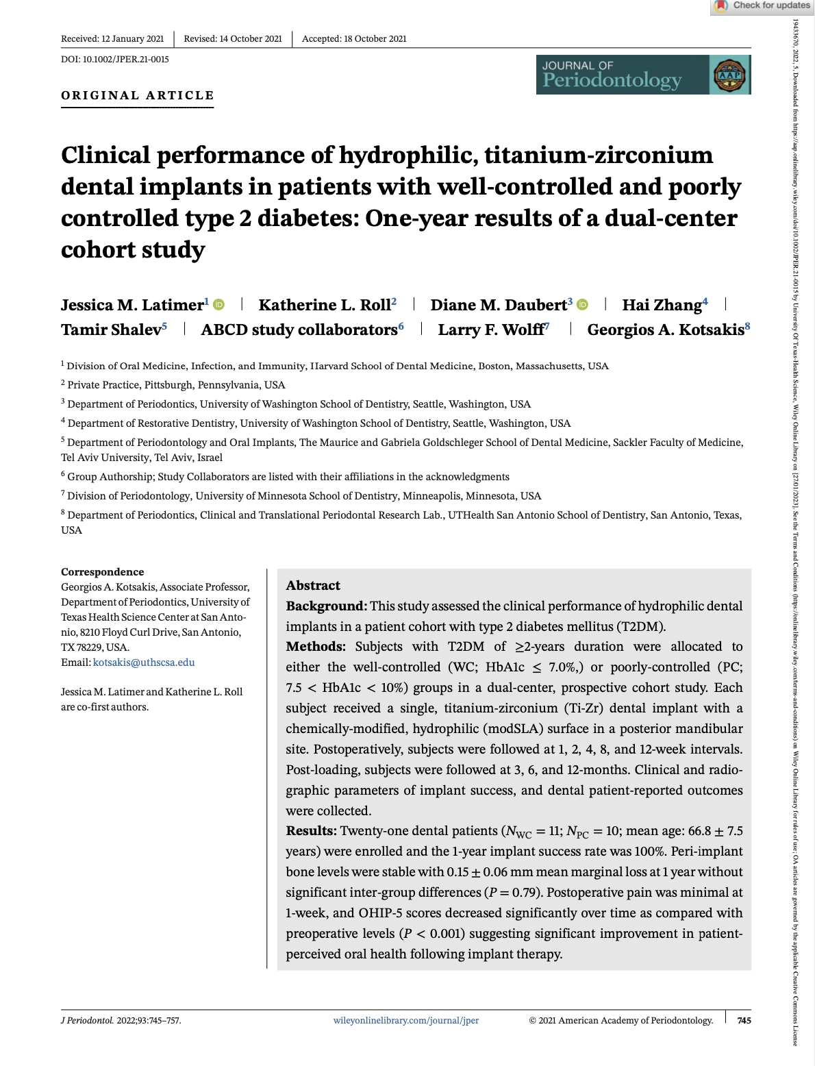 Clinical performance of hydrophilic, titanium-zirconium dental implants in patients with well-controlled and poorly controlled type 2 diabetes: One-year results of a dual-center cohort study