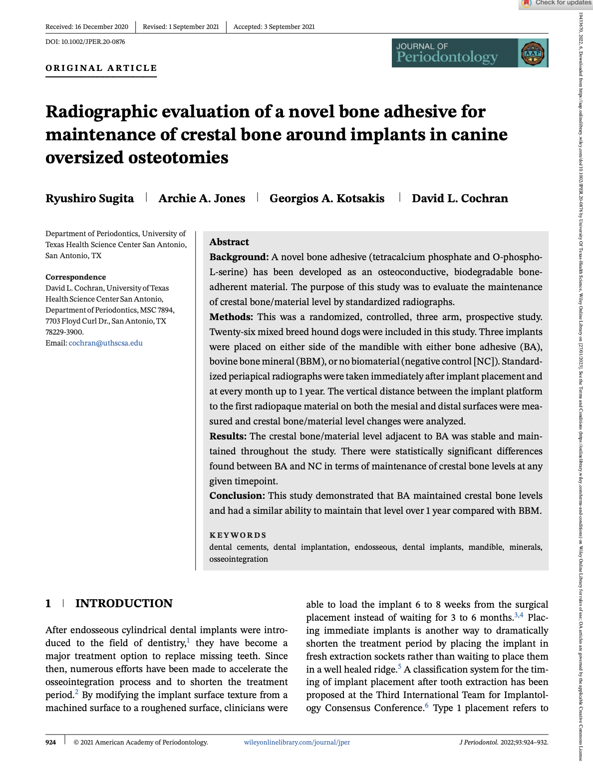 Radiographic evaluation of a novel bone adhesive for maintenance of crestal bone around implants in canine oversized osteotomies