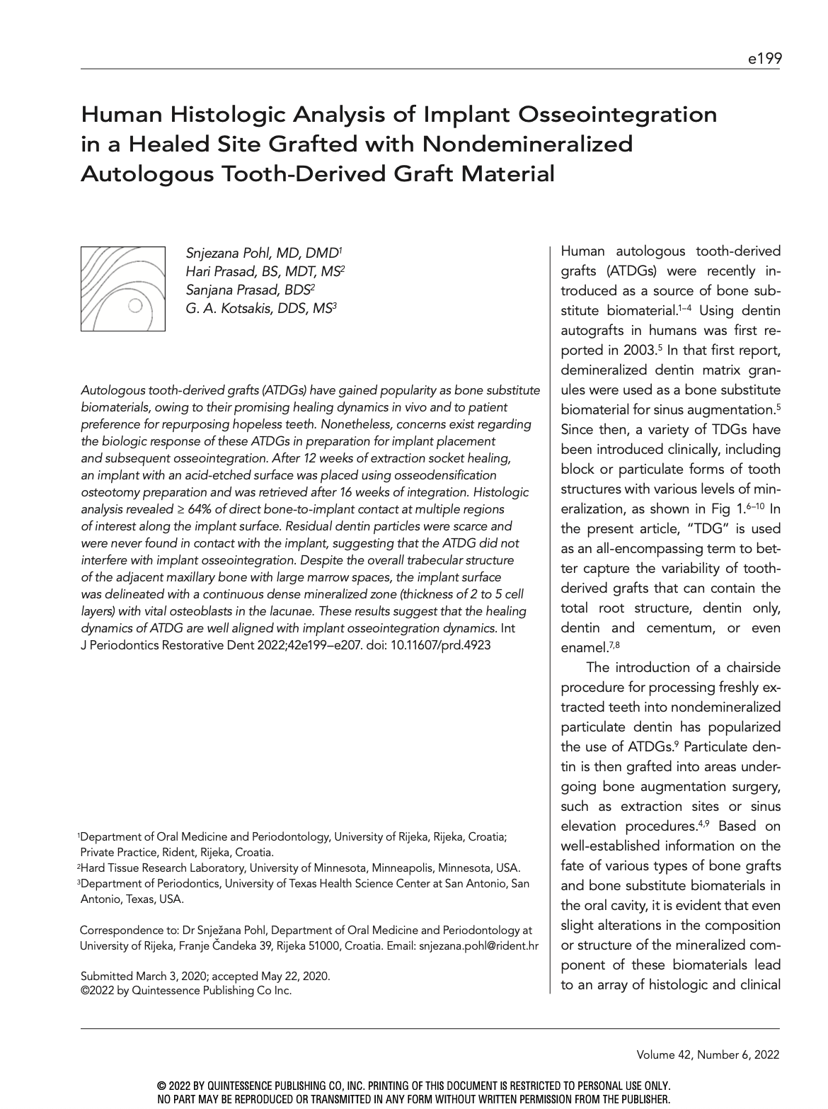 Human Histologic Analysis of Implant Osseointegration in a Healed Site Grafted with Nondemineralized Autologous Tooth-Derived Graft Material