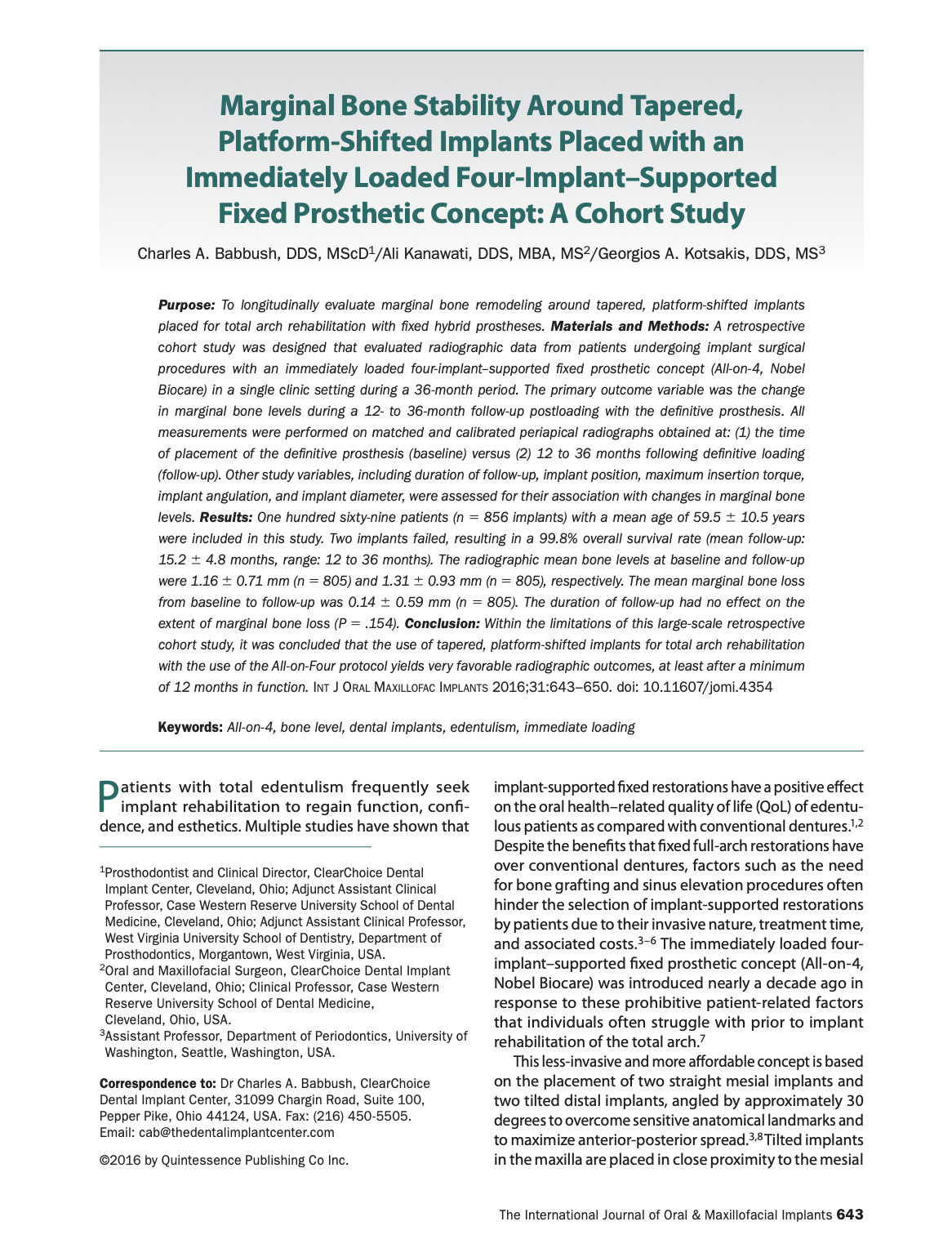 Marginal Bone Stability Around Tapered, Platform-Shifted Implants Placed with an Immediately Loaded Four-Implant-Supported Fixed Prosthetic Concept: A Cohort Study