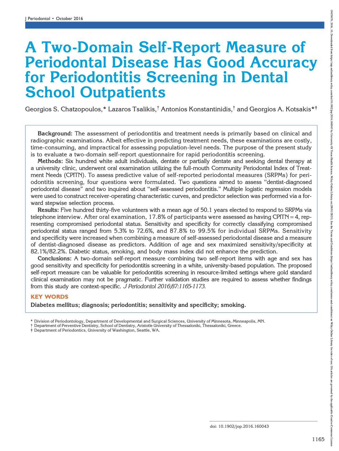 A Two-Domain Self-Report Measure of Periodontal Disease Has Good Accuracy for Periodontitis Screening in Dental School Outpatients
