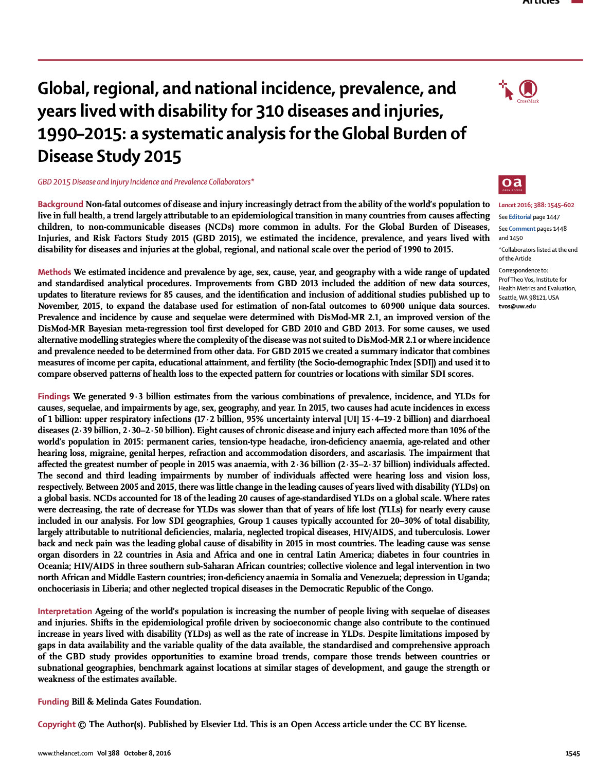 Global, regional, and national incidence, prevalence, and years lived with disability for 310 diseases and injuries, 1990-2015: a systematic analysis for the Global Burden of Disease Study 2015