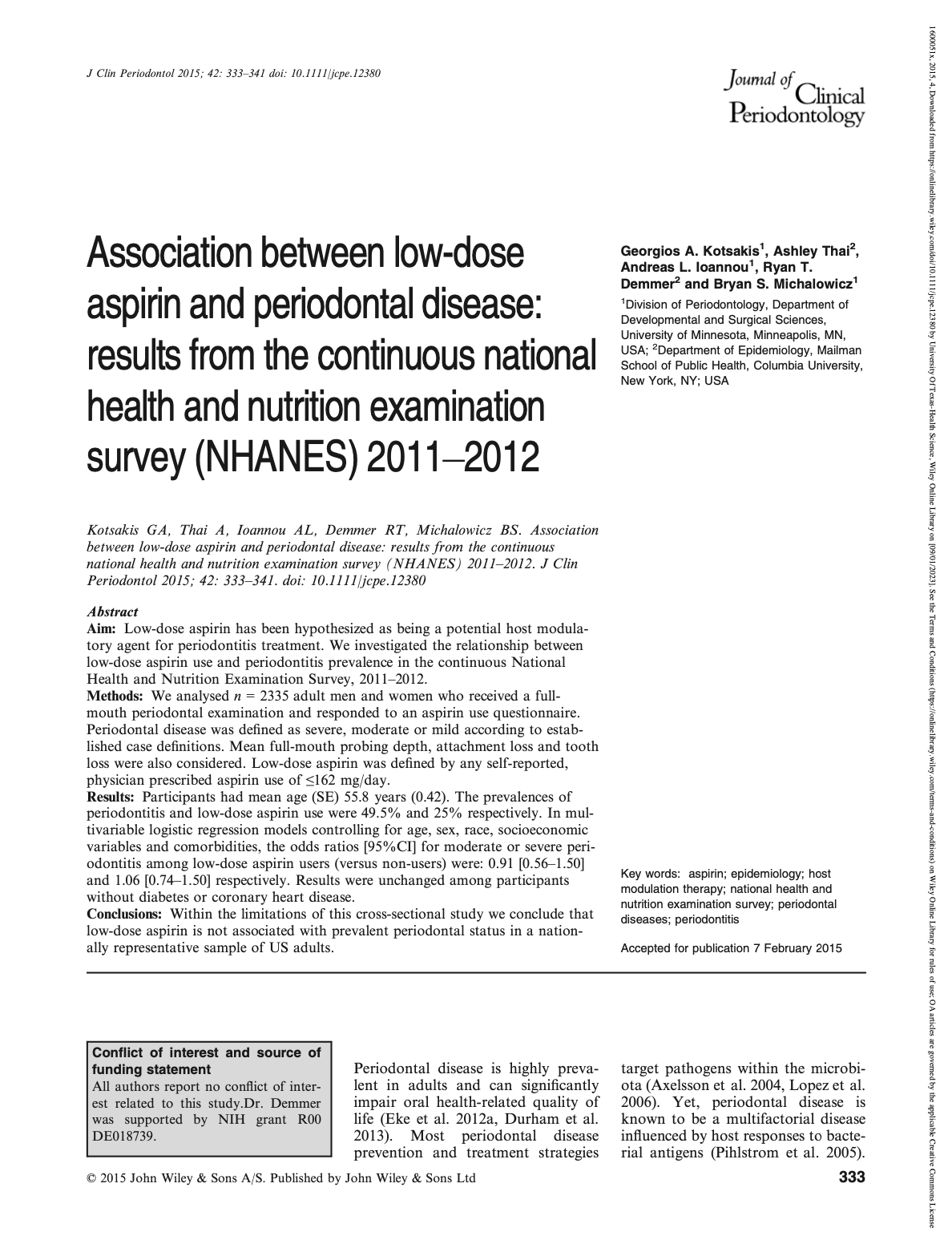 Association between low-dose aspirin and periodontal disease: results from the continuous national health and nutrition examination survey (NHANES) 2011-2012